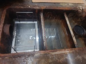 居酒屋の厨房のグリーストラップ内の油、ゴミを綺麗に取り除き消毒をさせていただきました。